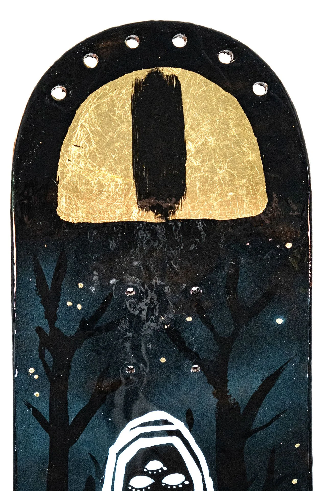 Three skateboard decks, airbrush, acrylics, gold leaf, 2024