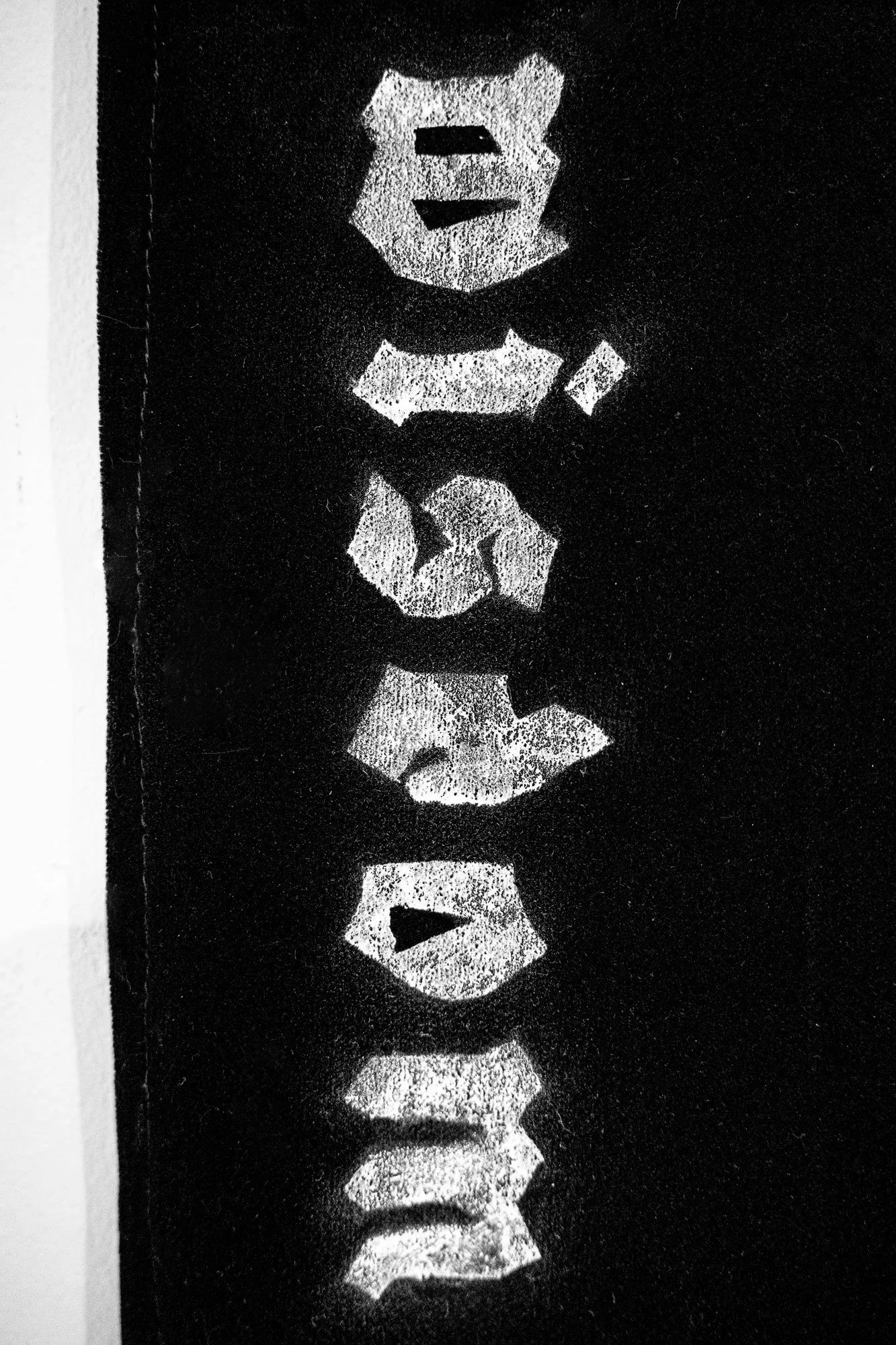 Banner, 180x120 cm. Velvet, leather, acrylic paint, spray paint, leaf gold (2023).