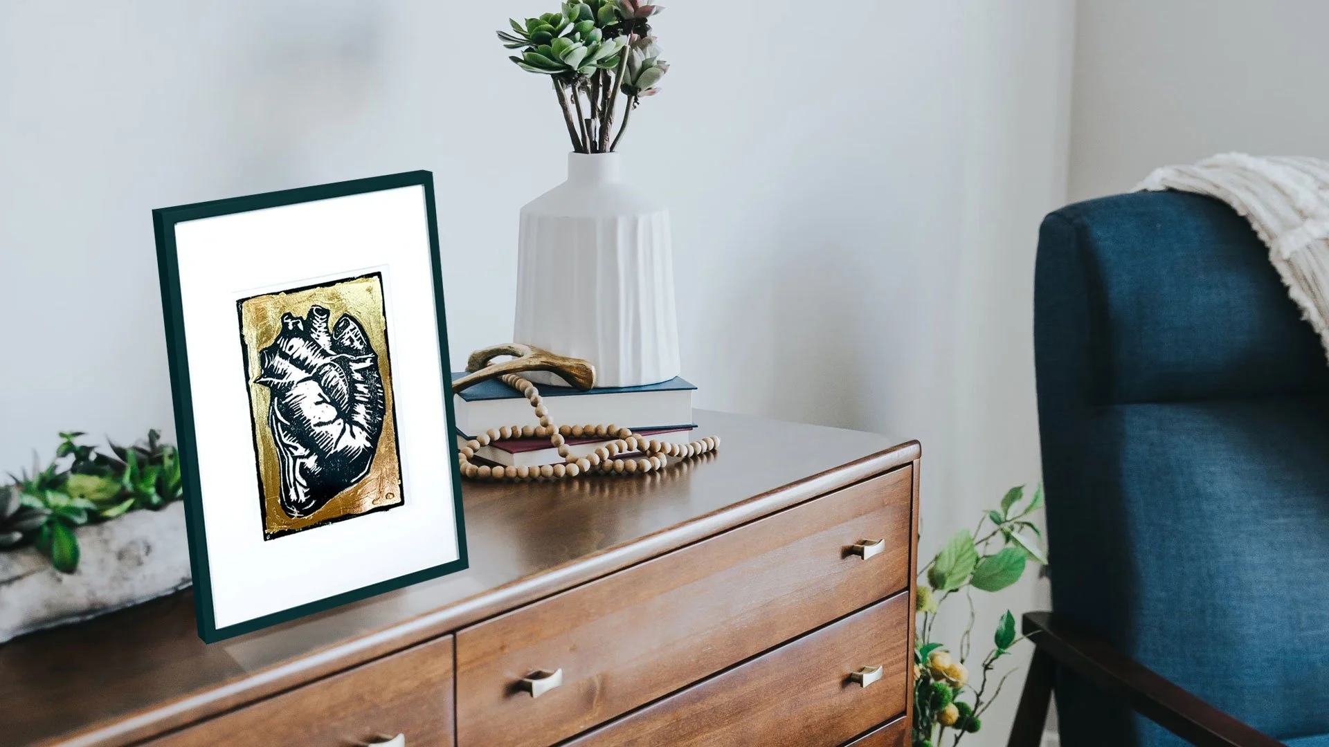 The anatomical heart lino print is available in 2 editions of 99 pieces each. As timeless balck-and-white prints and as an elegant, hand-gilded edition using 22 carat gold leaf. Prints available unframed and framed (Din A4 frame with passepartout).