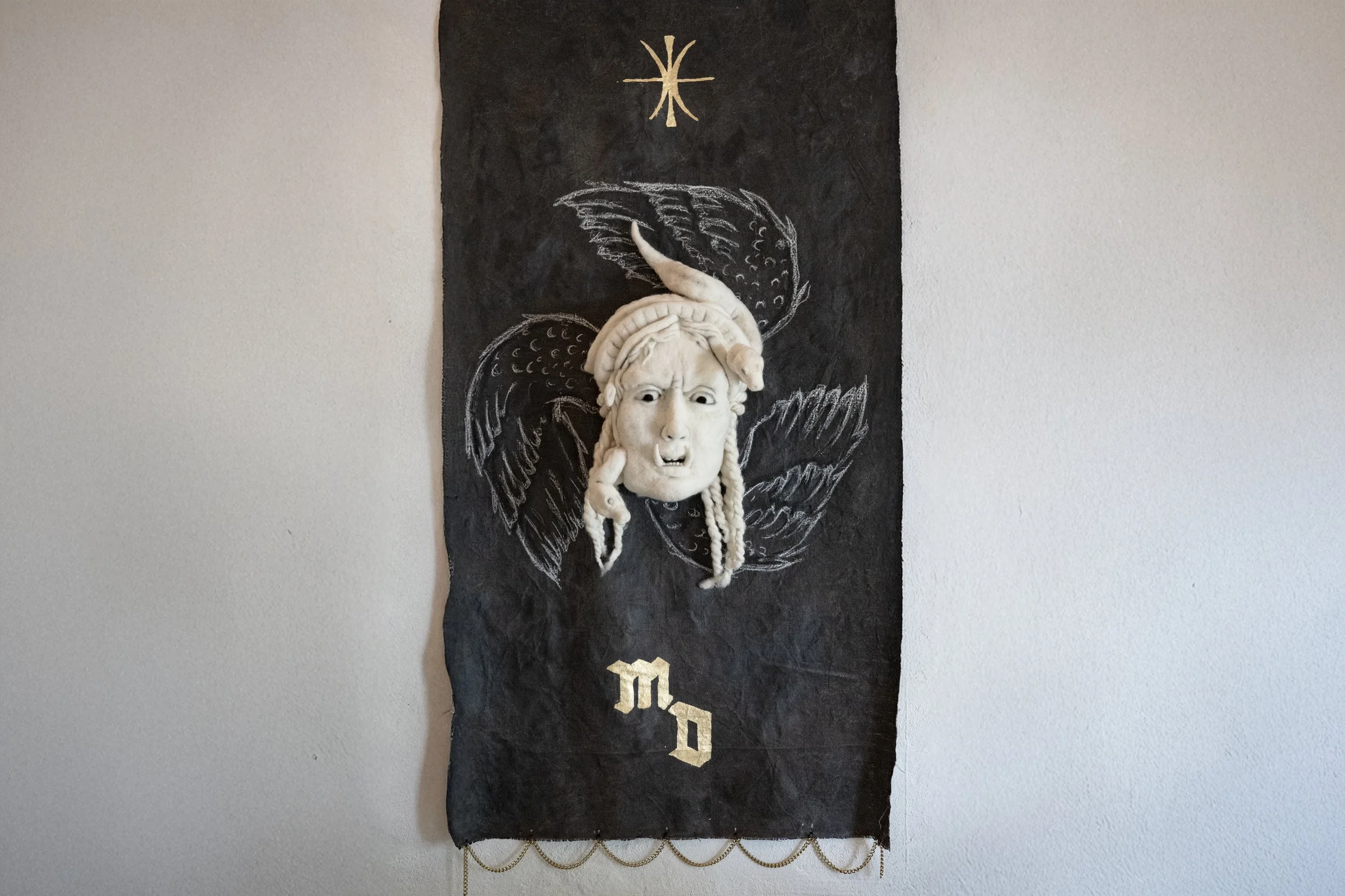 She was never the monster. In the oldest Greek stones, she had wings—watching over the city, not cursing it. We bring her back as protector, warrior, and witness. Blessed in ceremony, veiled in gold and felted breath.