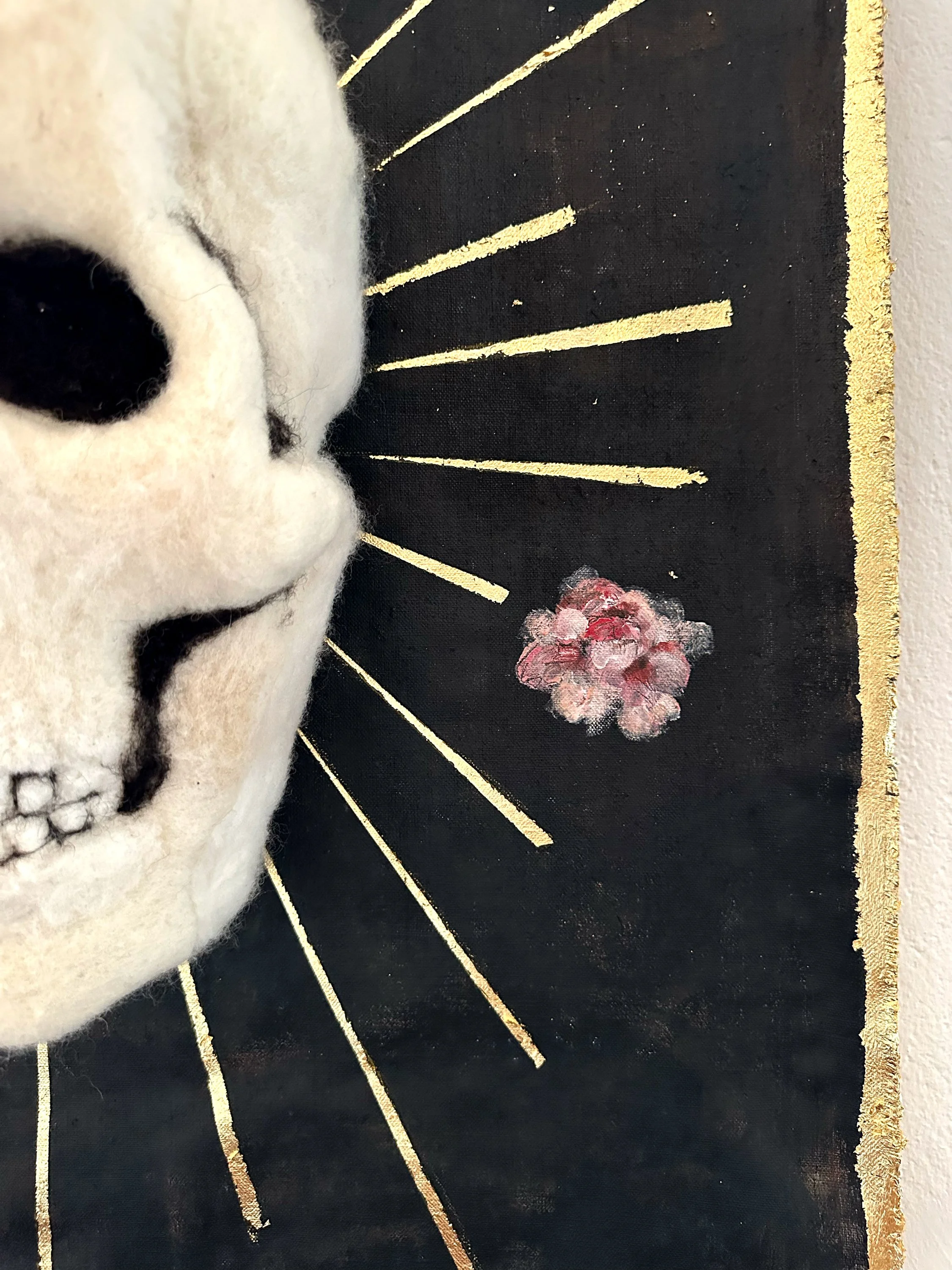 Like much of our work, the piece moves through the visual languages of devotion, mortality, and ritual, but shifts them into something more unstable and alive. The skull does not only signify ending; it becomes a vessel, a standard, a heraldic sign for cyclical return. In Rites of Spring, spring is not decorative. It is conjured as an ancient force: ecstatic, unsettling, and deeply bound to the knowledge that every beginning carries the dust of what came before.