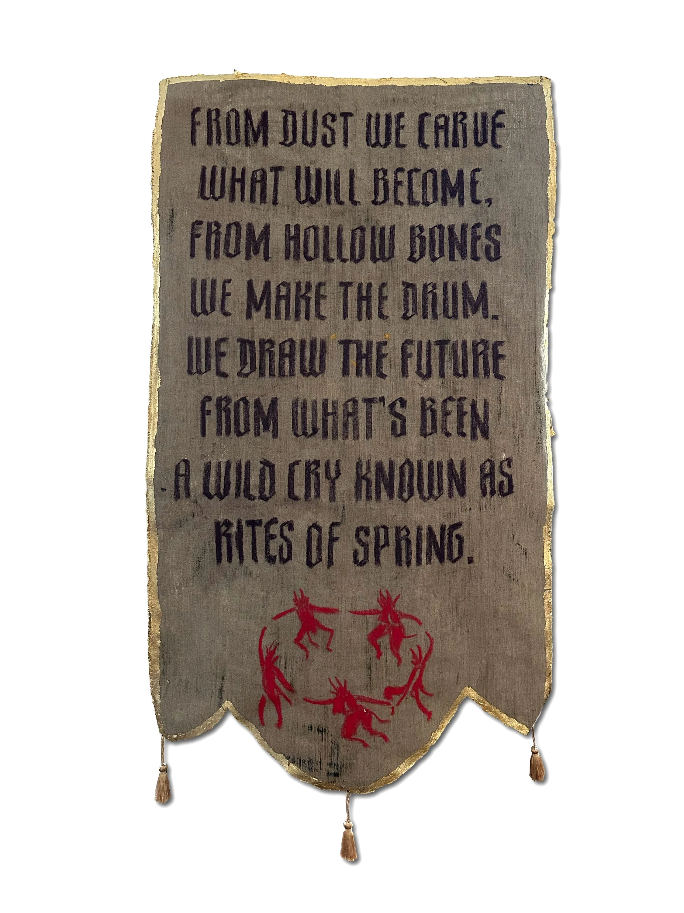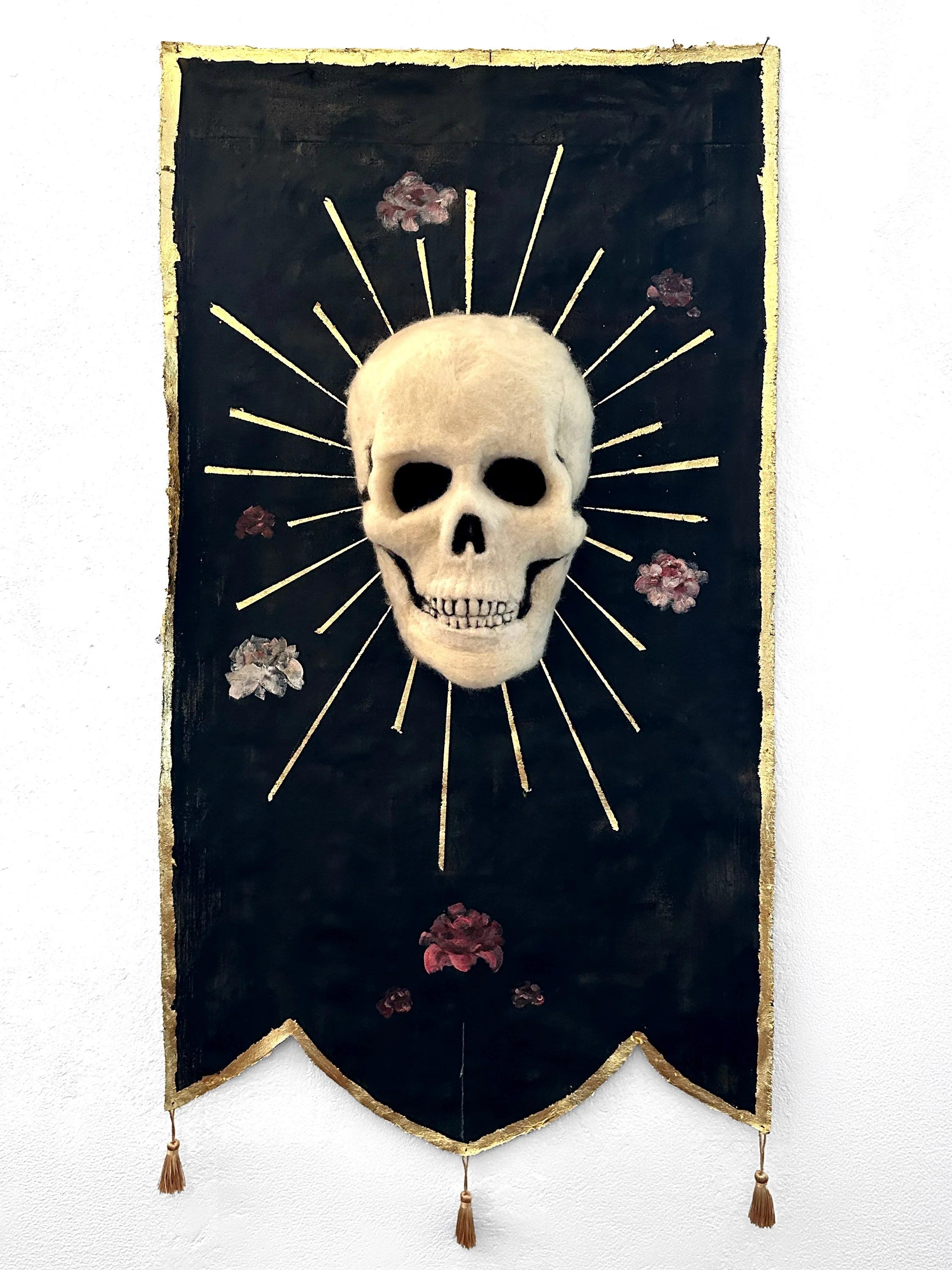 Rites of Spring takes the form of a ceremonial flag: part relic, part omen, part invocation. On its front, a pale skull hovers against a dark field, ringed by radiating lines like a saint’s halo or a burst of force, while scattered flowers interrupt the severity of the image with signs of bloom, fragility, and return. The work holds death and renewal in one emblem, treating spring not as innocence, but as a season of rupture — a threshold where beauty, violence, memory, and transformation arrive together.