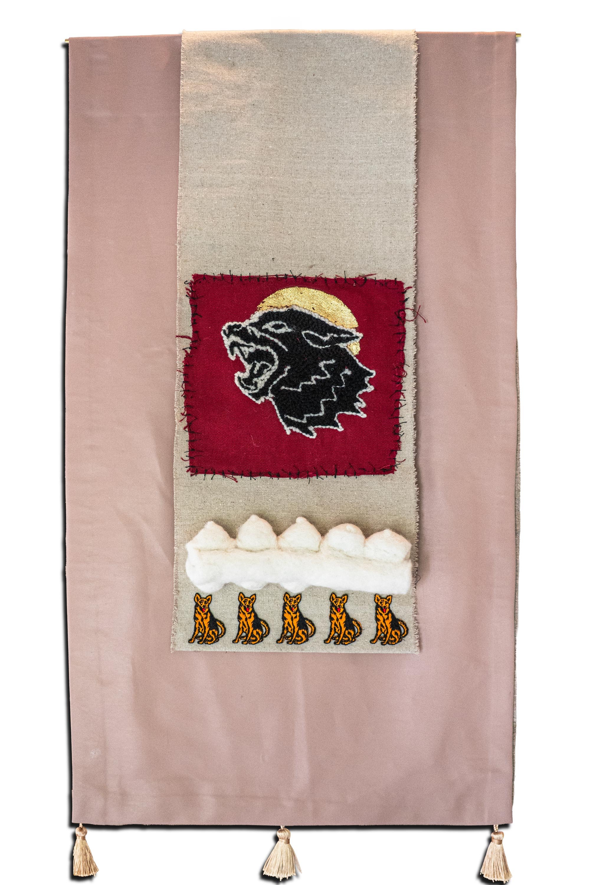 Wolfmother is a textile banner in which softness, discipline, myth, and politics coexist without hierarchy. A pink leather ground carries a stitched wolf icon, needle-felted teats, and a rigid row of identical German Shepherd badges.
