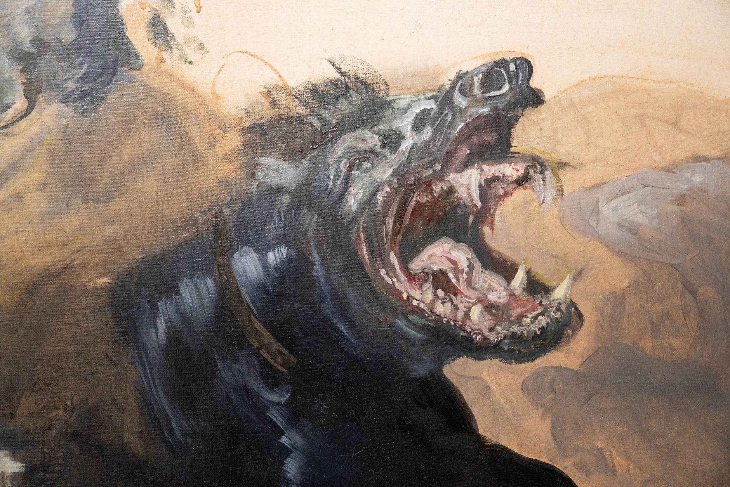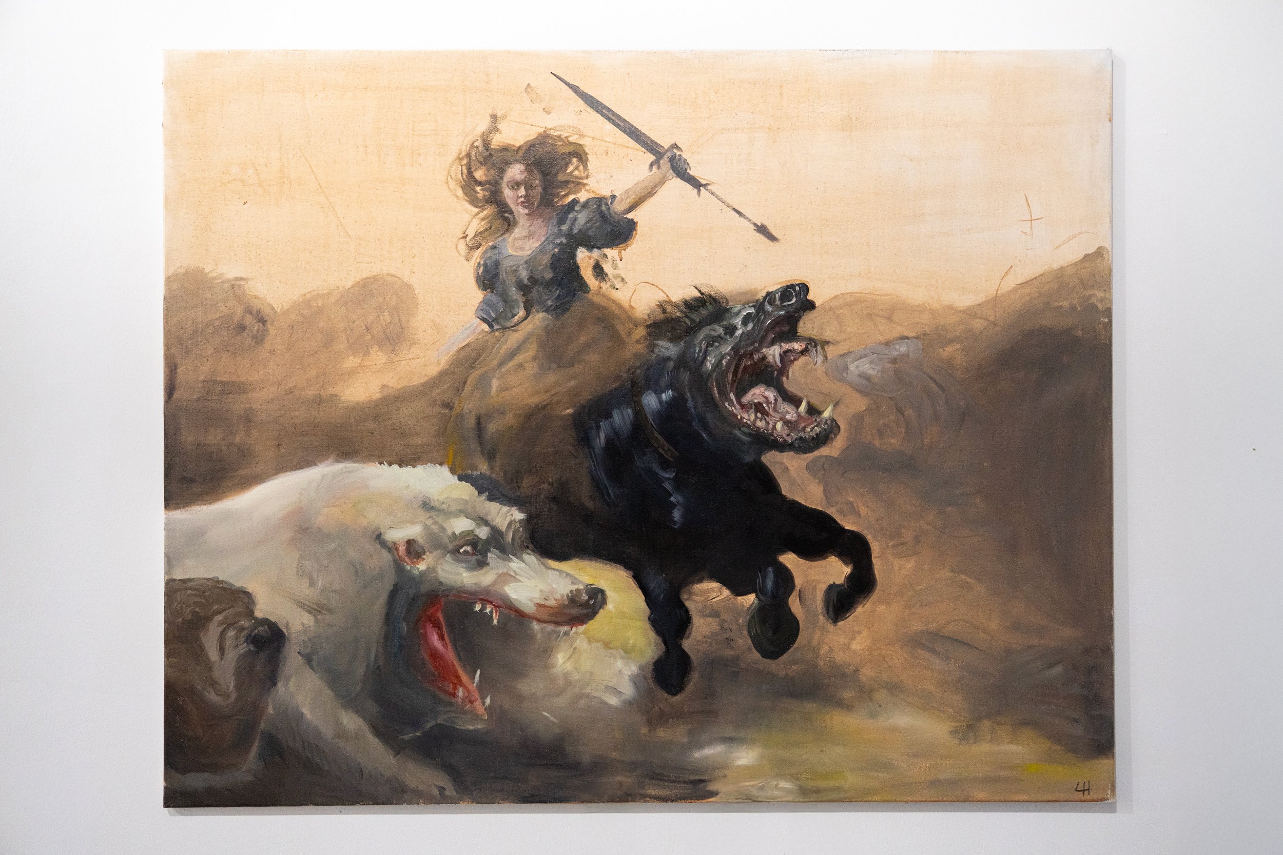 Lotte Hauss answers this imbalance not with illustration, but with a re-authoring of the archetype. In Daydream, the central figure is not muse, bride, ornament, or casualty; she is momentum. A warrior woman—wind-lashed, upright, unsentimental—rides into the frame as a force of nature rather than a character in someone else’s story. The beasts around her, with their unruly, mythic presence, nudge the viewer to recognise the work as a contemporary intervention: a staged impossibility that exposes the old staging as equally constructed.