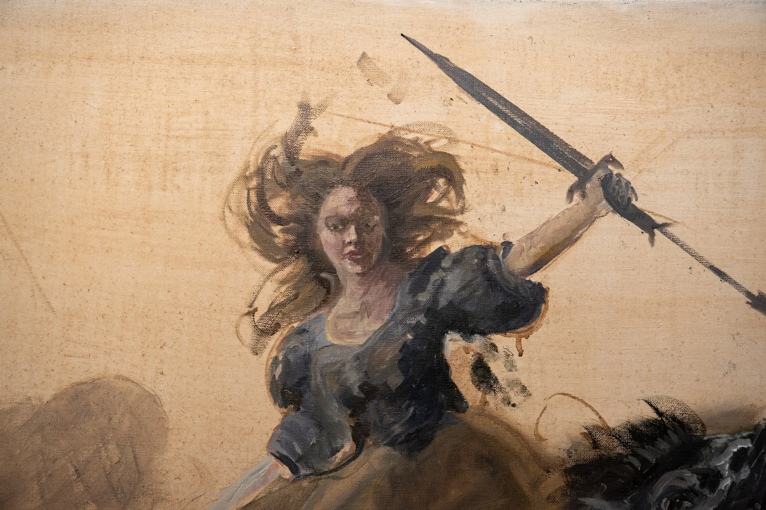 This is where the “daydream” turns feral. The picture behaves like a remembered legend and a critique at the same time: it keeps the solemn lighting and epic compositional drama of the canon, then breaks the canon’s casting. The result is a new narrative in the old tongue—one that refuses the inherited roles and installs another kind of heroine: not exceptional because she is “like a man,” but sovereign because she is written as power without apology.
