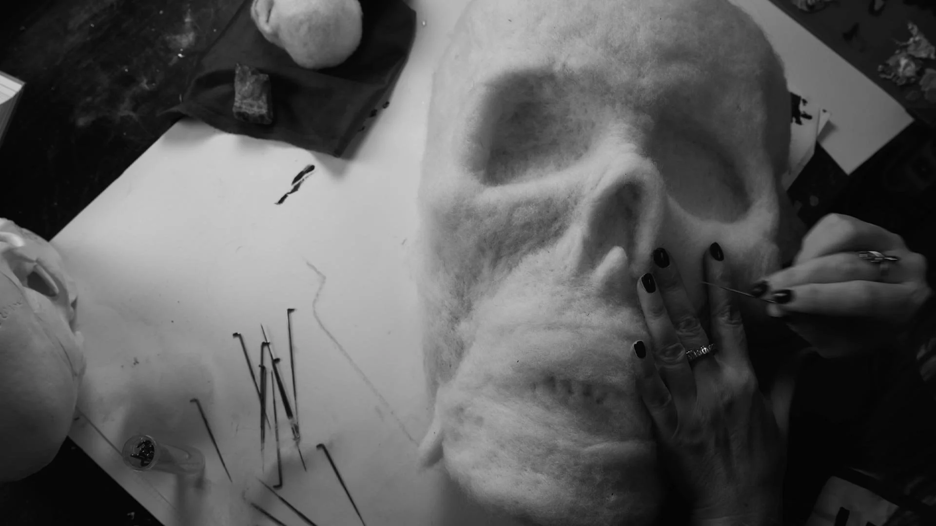 We create needle-felted sculptures by working loose wool fibers with barbed needles until soft matter slowly condenses into form. Skulls, saints, masks, and sculptures emerge from wool. The process is slow, tactile, and almost ritual. There is an uncanny tenderness in the material. Wool can feel innocent, domestic, even childlike — yet here it carries images of death, devotion, transformation, and memory. Through softness, the skull becomes touchable. The symbol becomes intimate.