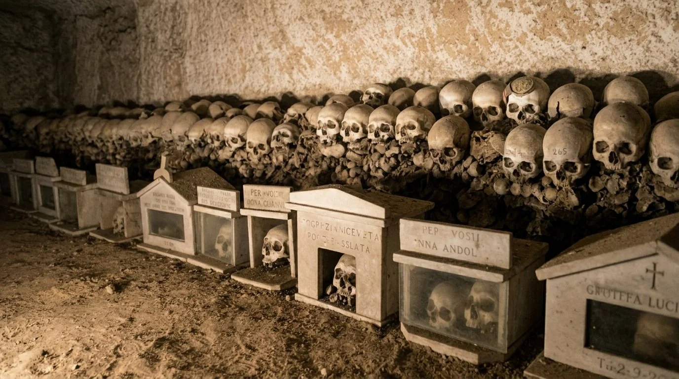 One of the inspirations behind this work is the cult of the anime pezzentelle in Naples, Italy — the “poor souls” of the forgotten dead. In places such as the Fontanelle Cemetery and the church of Santa Maria delle Anime del Purgatorio ad Arco, anonymous skulls were once adopted by the living, often by women. They were cleaned, named, decorated, and prayed for — and, in return, were believed to answer through dreams, protection, or favors. For Maison Douce, this ritual is a powerful image of exchange. The forgotten receive attention, tenderness, names, and care. In return, they may offer meaning, orientation, or unexpected reward. It is a folk practice of memory and intimacy — a negotiation with the invisible.